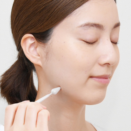 筆者は毎日、美容液を塗りながらKAOYOMI 01の二股部分を使い、耳たぶの下から下顎角(エラの部分)に向けて、ゆっくりと圧をかけていきます。耳の前・後ろを丁寧に押しほぐすと、じわーっと唾液が溢れ出すのを感じるはず。それはまさに、若返りホルモンが巡り始めた証拠です。